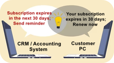 A technology solutions provider offers a platform that has an annual subscription renewal. An e-mail notification uses information from their CRM and accounting system to send the customer a 30 day reminder of the renewal. A summary of all upcoming renewals is sent in a report to the designated sales person to keep them in the loop.